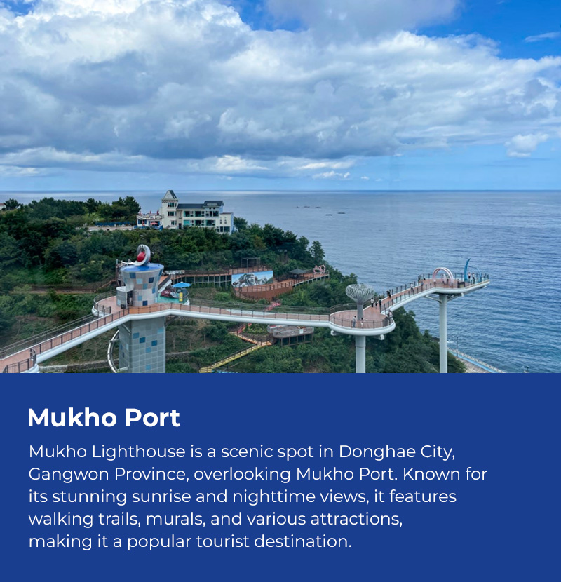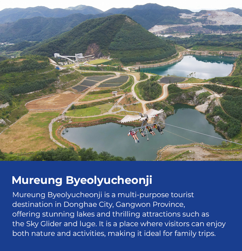 - Afternoon Schedule: Mureung Byeolyucheonji (Sky Glider, Alpine Coaster, Crane Observatory) → Check-in at Donghae Boyang Oncheon Convention Hotel → Dinner