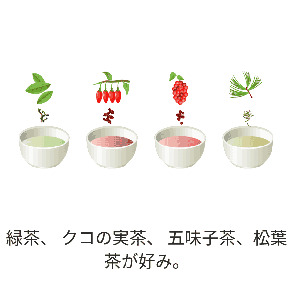 緑茶、 クコの実茶、 五味子茶、松葉茶が好み。