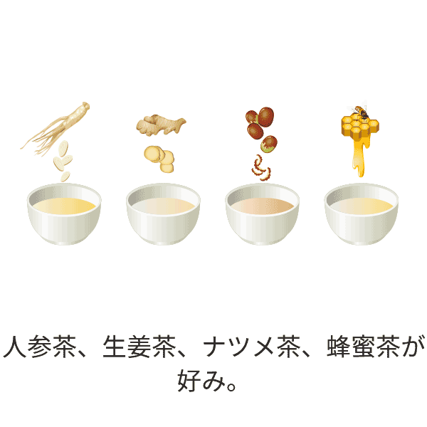 人参茶、生姜茶、ナツメ茶、蜂蜜茶が 好み。